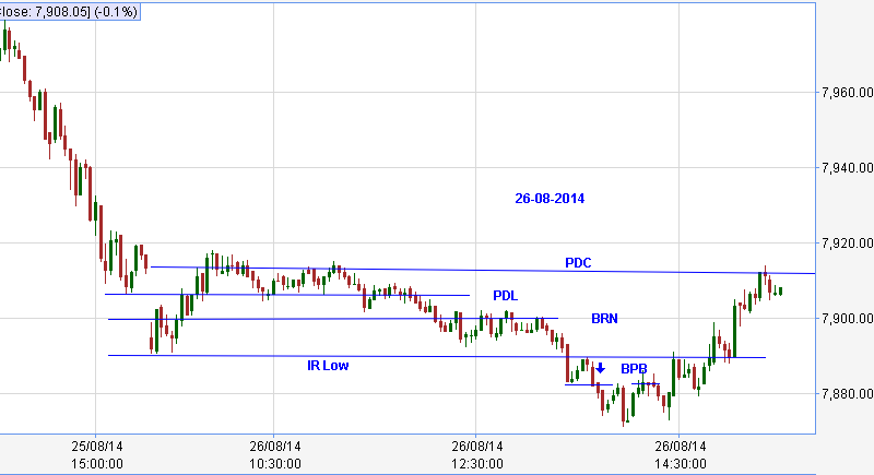Traded the August chart. Nifty gaped down below PDL. IR formed. Did not trade the area between BRN 7700 and PDL 7750 as this area was PDC and PDL in continuous charts. Nifty sold touching PDL. Went short below IRL. After a scary pull back it was smooth ride till NS BRN level.